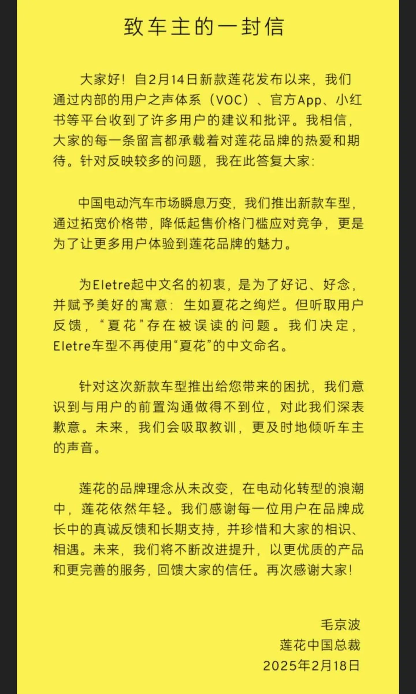 毛京波表示,一是品牌定位不变,仍为三大跑车品牌之一,专注驾驶体验与操控性能;二是因中国市场销量未达预期,拉宽价格带以适应不同市场需求,但未回应为何不用新车型下探低价市场;三是当场宣布取消Eletre备受争议的中文名“夏花”,将用官方账号发致全体车主的信,针对老车主提升品牌高度的诉求,内部讨论方案后沟通。