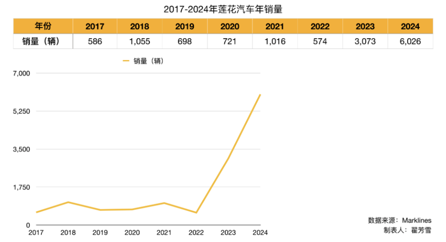 自2017年加入吉利开始,莲花的销量呈可观的涨势。根据全球汽车数据平台Marklines统计,莲花的全球年销量由2017年的586辆跃升至2024年的6026辆。