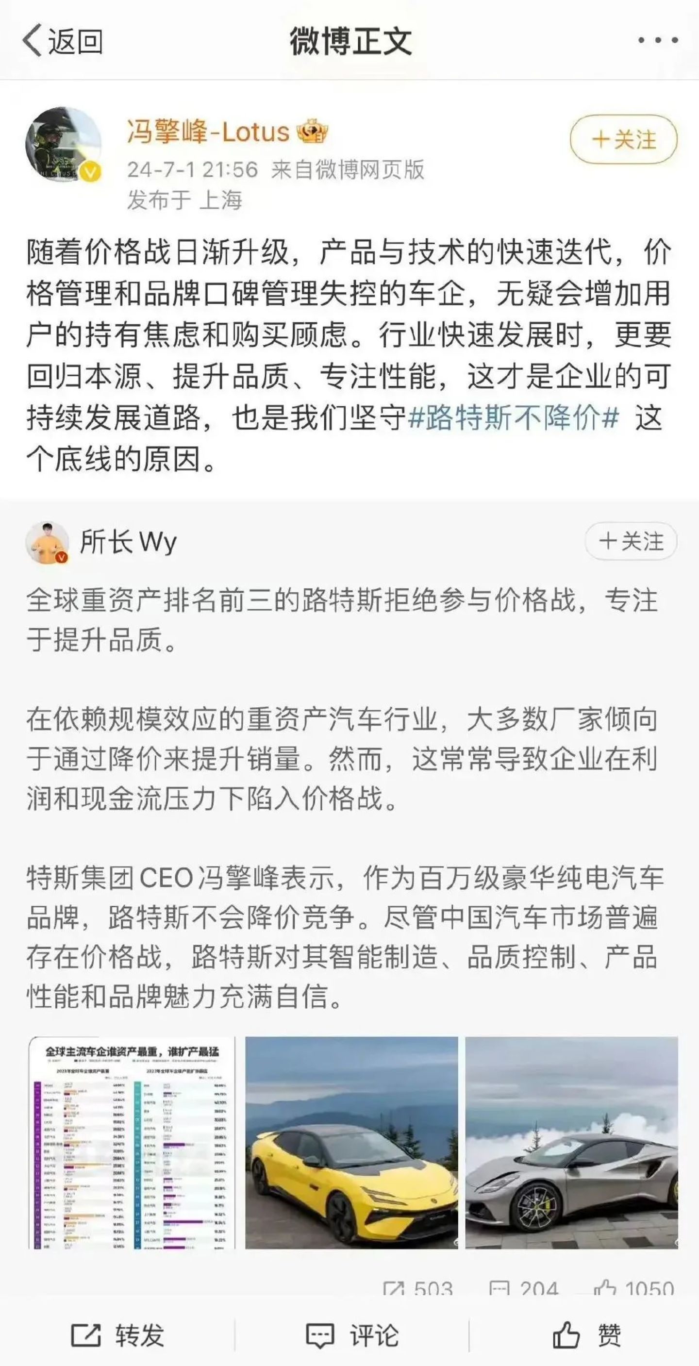 让车主产生“被骗”感受的,是在这之后莲花曾作出“不降价”的承诺。2024年7月1日,莲花集团CEO冯擎峰发微博称:“价格管理和品牌口碑管理失控的车企,无疑会增加用户的持有焦虑和购买顾虑。行业快速发展时,更要回归本源、提升品质、专注性能,这才是企业的可持续发展道路,也是我们坚守#路特斯不降价# 这个底线的原因。”但目前,这条微博已经不可见。