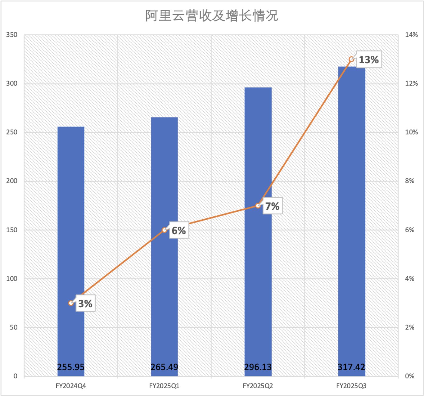 本季度,阿里云实现营收317.42亿元,同比增长13%,相比上一季度7%的增速接近翻倍,该增长得益于AI相关产品推动的公共云收入增长,AI收入已连续六个季度三位数增长。
