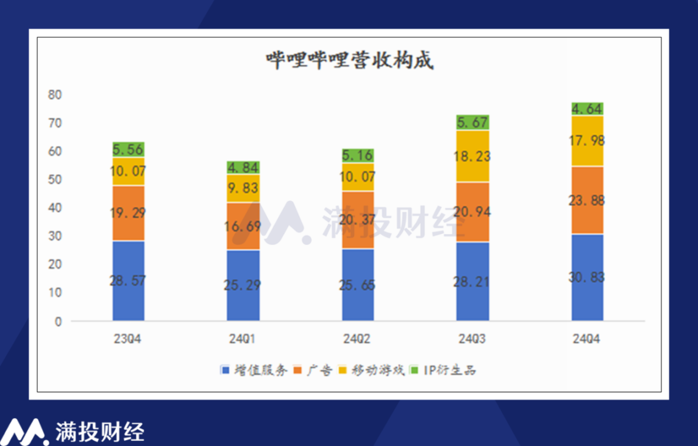 从整体数据来看,2024年全年,B站实现了286.3亿元的收入,同比增长19%,其中四季度营收达到77.3亿元,同比增长22%,环比也实现了约6%的增长。从收入构成来看,全年支撑B站收入的业务共有四项,分别为增值服务、广告、移动游戏、IP衍生品。其中,仅有IP衍生品业务在2024年“开了倒车”出现营收下降的情况。