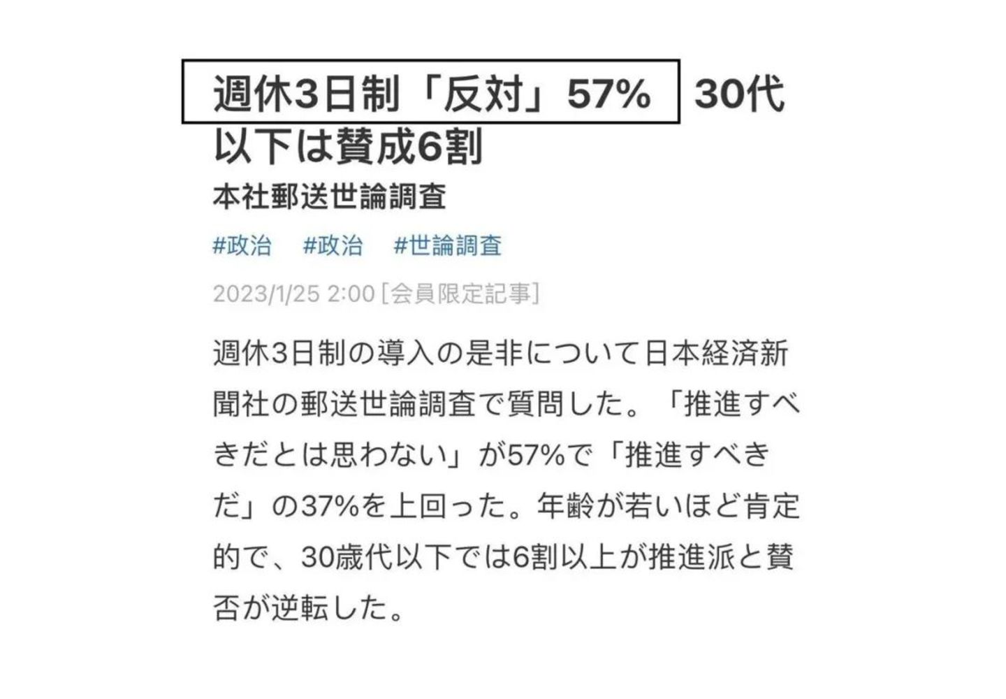 更早之前,2023年初《日本经济新闻》的一份民调显示:针对“上四休三”制度,57%的受访者认为“不应该推进”,远高于认为“应该推进”的37%。