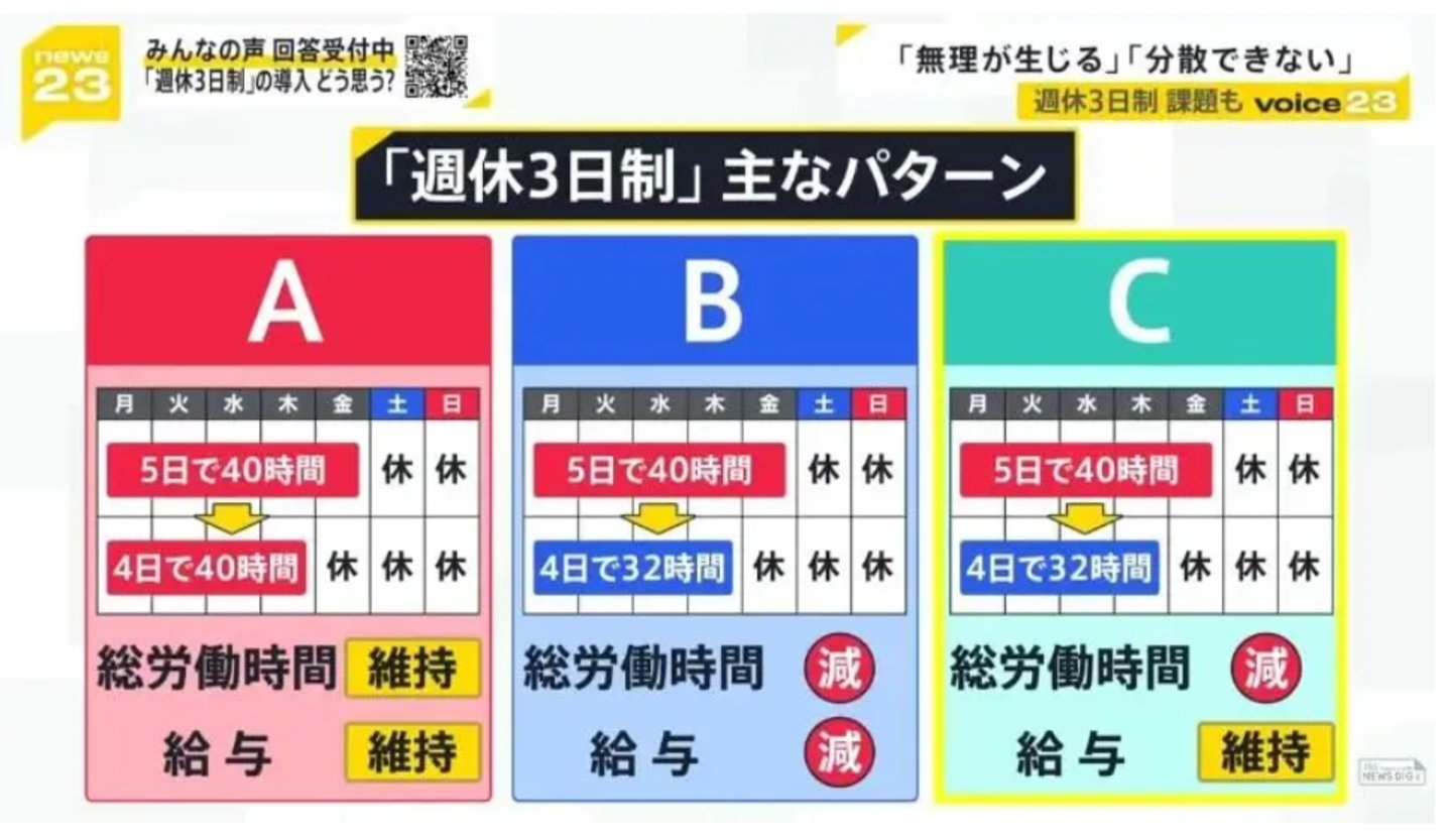 目前,日本现行的“上四休三”工作制,大致分为三种类型: