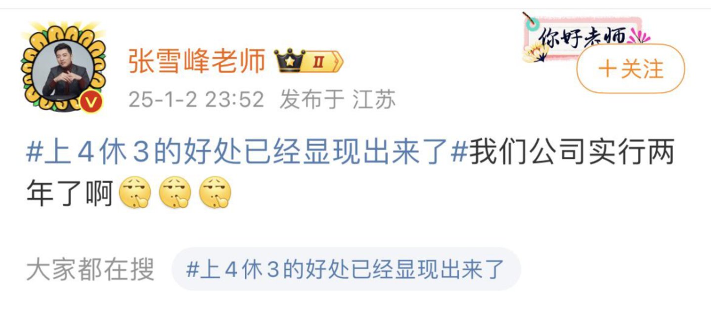 事实上,中国也有企业已经实施了自己的“上四休三”制度。张雪峰就曾公开发微博:我们公司实行两年了。