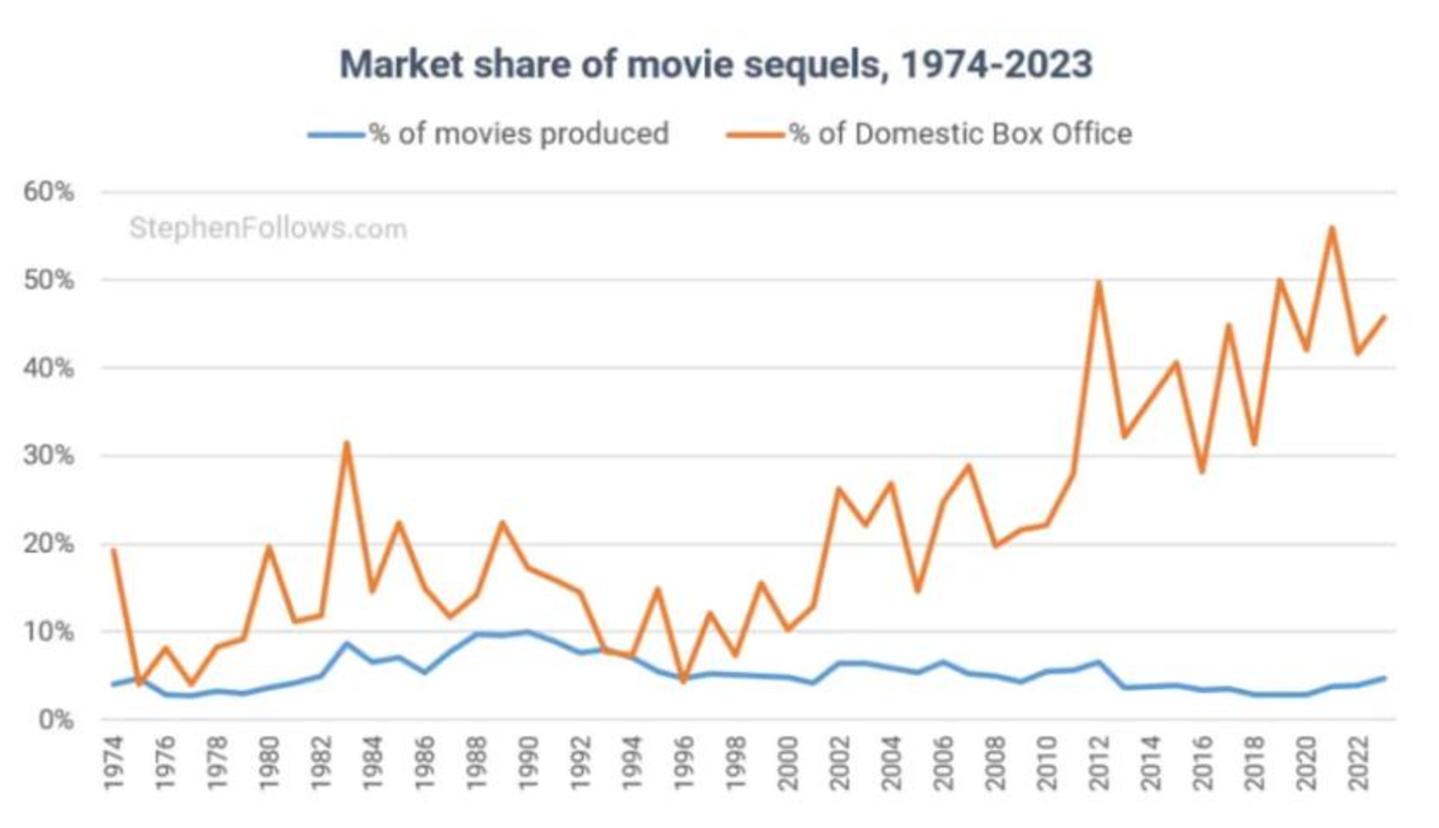 同时,过去50年间,系列电影(即至少有一部续集的电影)的供给并没有明显的变换,维持了4%-10%的年产出占比。但系列电影的票房表现增幅相当夸张,从5%增长至年度票房的40%-50%区间范围内。