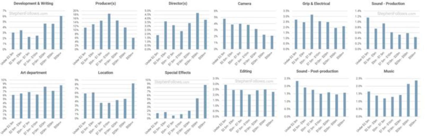 图:影片制造不同工种的成本占比,来源:StephenFollows.com
