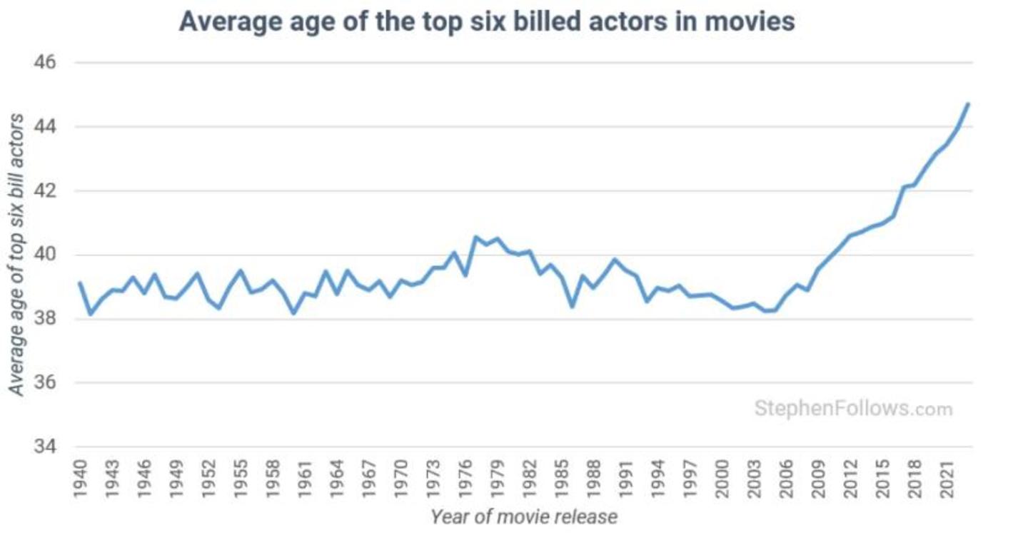 首先,根据StephenFollows.com的统计研究,近年来影视制作一个明显的趋势是,票房表现较好的电影,演员的平均年龄出现明显的提升,自1940-2009年间维持在38-40的区间内,2009年以后表甚至45岁左右。