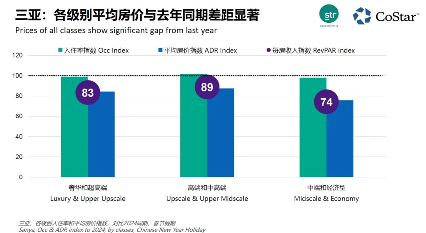 STR数据显示,春节期间三亚市场的入住率OCC与去年基本持平,平均房价(ADR)虽在中国内地市场拔得头筹,但相比去年大幅下跌,每房收入指数RGI仅为86。