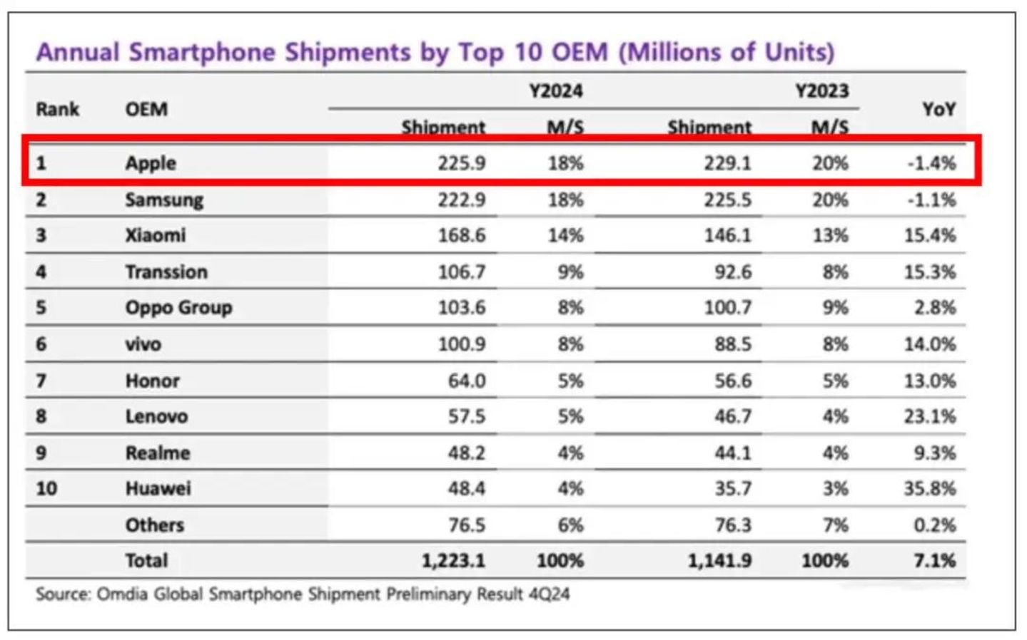 2024年,虽然苹果智能手机的销量同比下滑了1.4%,但依然稳居全球第一的宝座,苹果公司的市值亦依然高高在上。