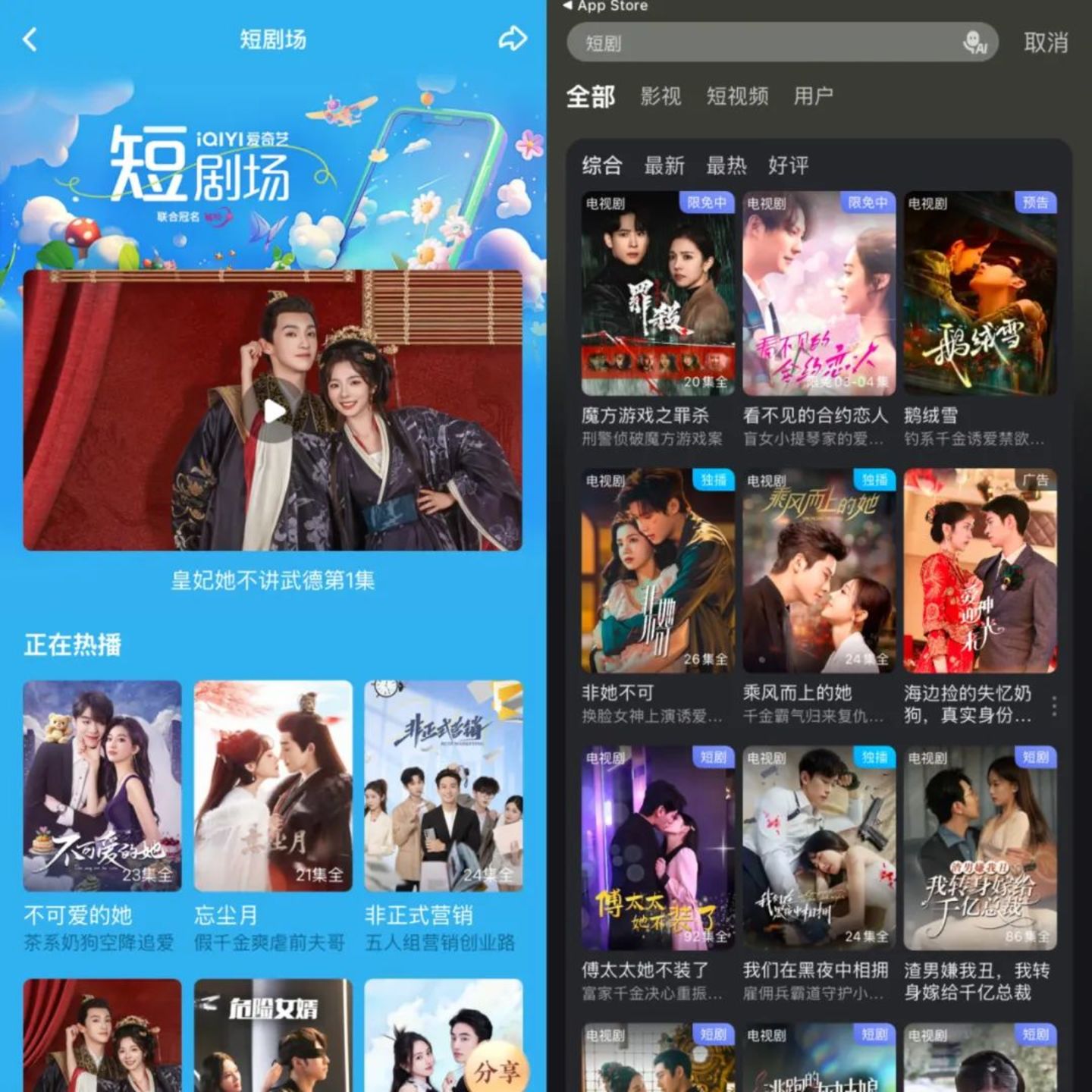 除了腾讯视频,爱奇艺也将精品短剧作为主推方向。爱奇艺的“短剧场”主打横屏,覆盖古装、悬疑、都市情感等类型,强调剧情完整性和制作水准向长视频靠拢,例如使用专业分镜、电影级画面和科班演员。