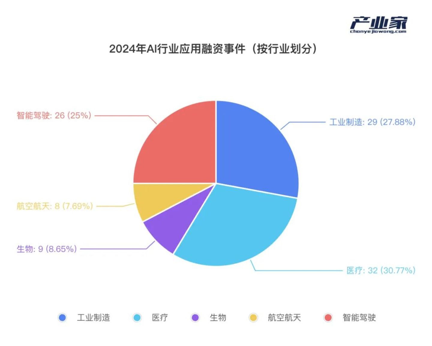 据IT桔子,2024年AI行业应用融资事件共209起,占比41.22%,比例与去年几乎持平。产业家统计,2024年AI行业应用融资事件当中,资本主要集中在五大行业,分别为工业制造、医疗、智能驾驶、生物和航空航天。其中,绝大多数的机器人都被归为工业制造领域,而自动驾驶和无人驾驶也都归为智能驾驶一类。