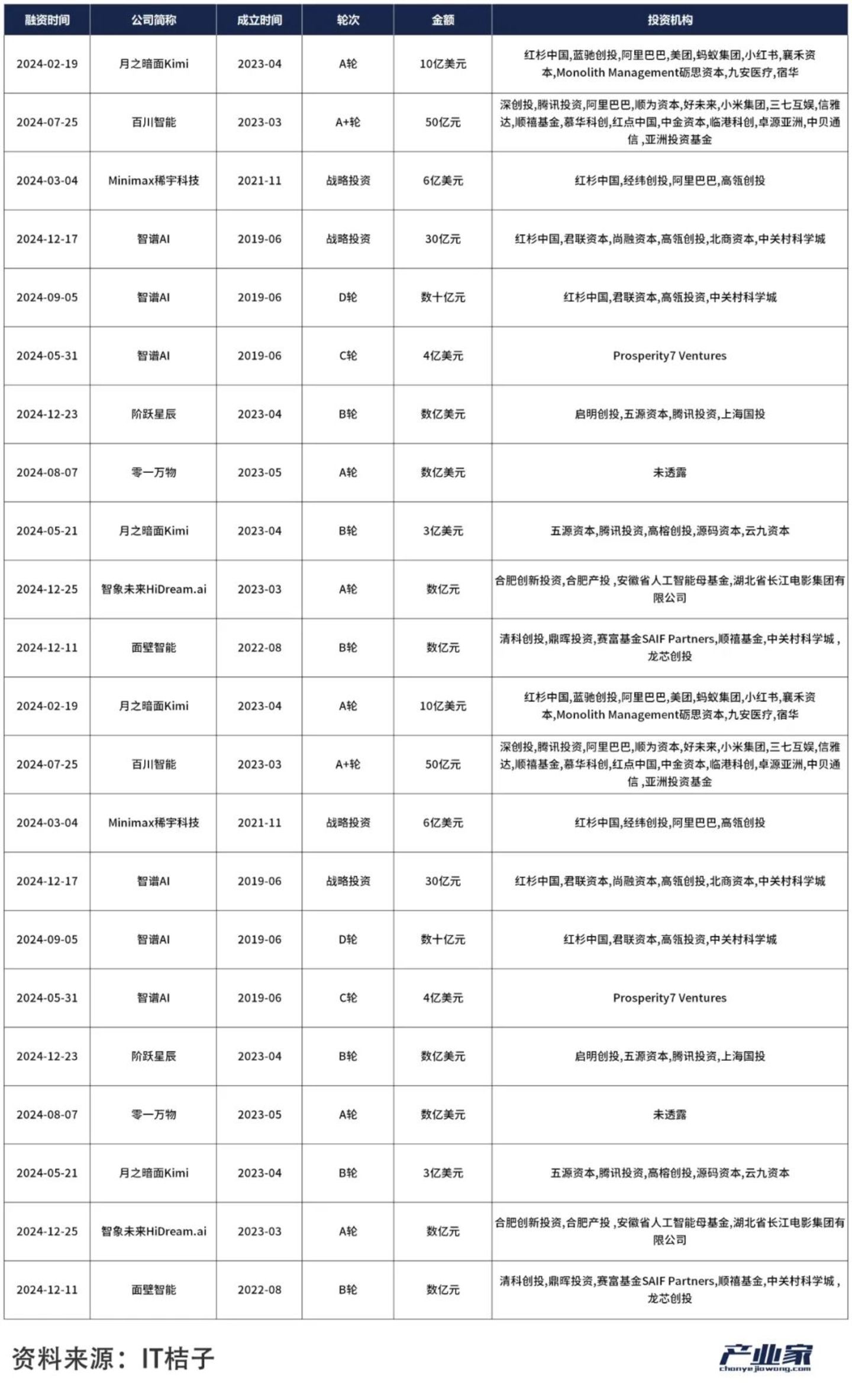 产业家统计,2024年,AI领域融资金额高达6619亿元人民币,同比增长101.9%;然而投资事件数与上一年并无相差太多。AI项目中出手最频繁的知名投资机构“红杉中国”,在过去一年投资金额整整翻了一番,而投资数量却同比减少55.6%。可以看到,在不少明星AI公司的投资方中,都有它的身影。