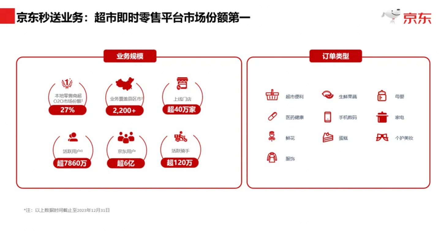 京东2024年Q3财报显示,在“国补”影响之下,京东自营业务收入2046亿元,同比增长4.8%,而2024年Q2,京东自营业务收入同比零增长。同时,在2024年初,京东就定下了三大方向,也就是“三大必赢之战”,除了内容生态和开放生态,即时零售也位列其中。