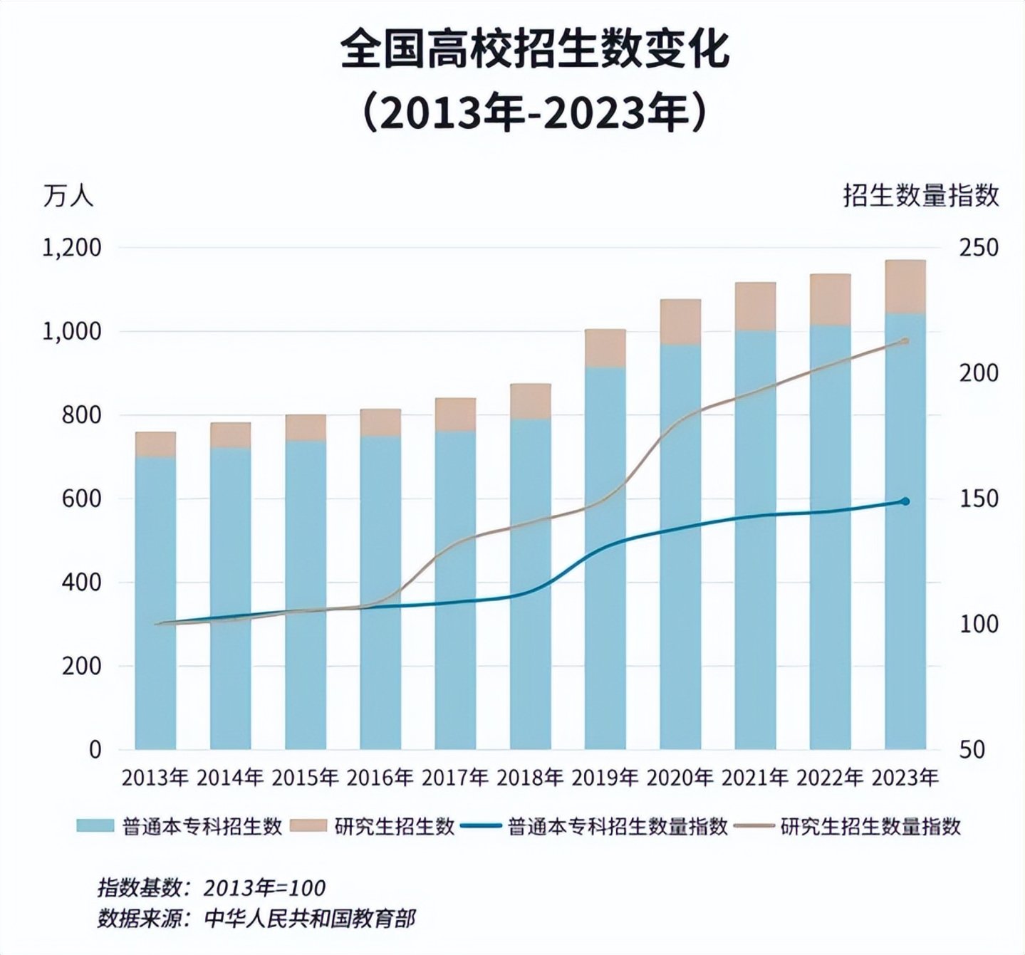 尽管幼儿园、小学阶段学龄人口数量下行趋势已现,高等教育在校生规模仍在持续增长。过去五年,全国高考报名人数分别为1031万、1071万、1078万、1193万、1291万。