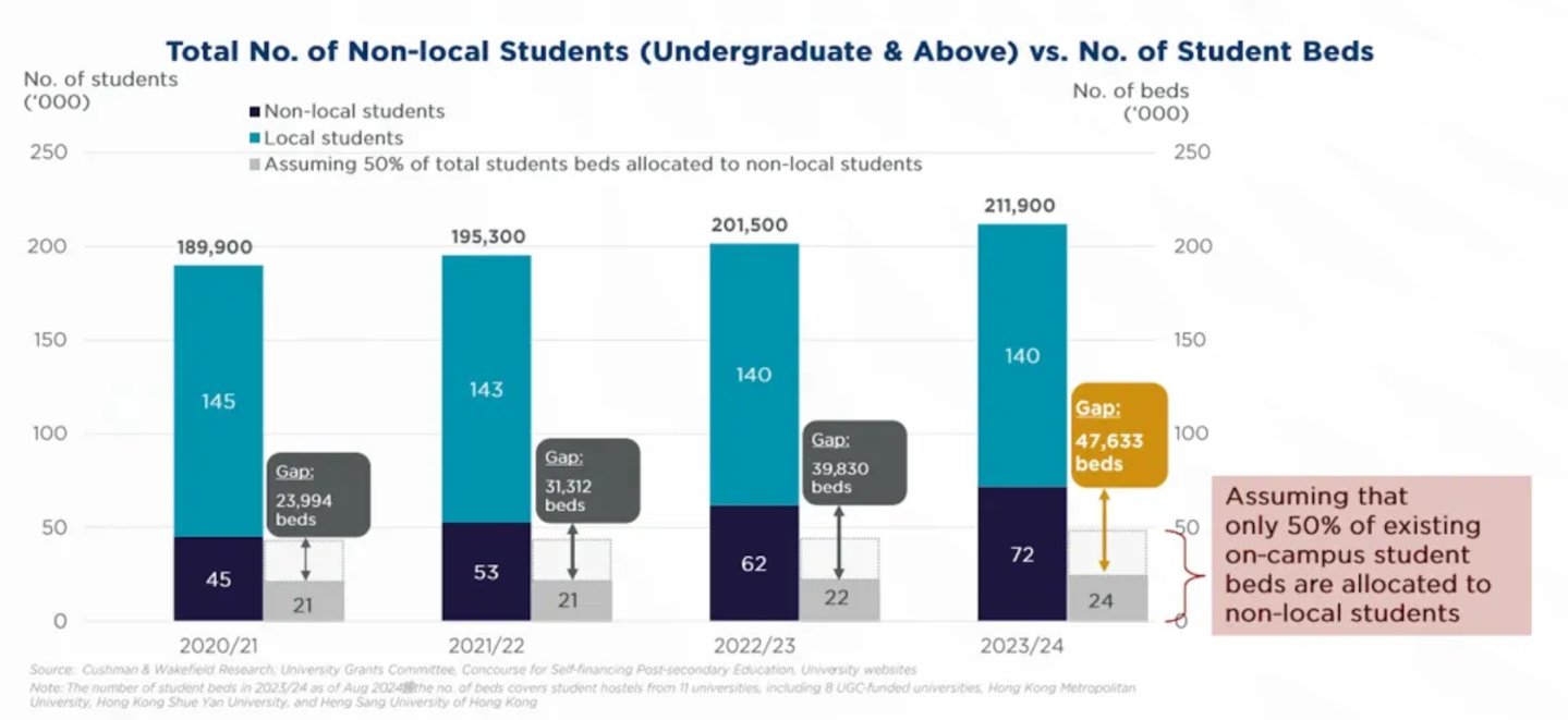 据戴德梁行估算,2023/24学年非本地学生的宿位短缺超过47600个,未来的额外需求估计将达15700个宿位,整体大学床位的短缺至少达55400个。