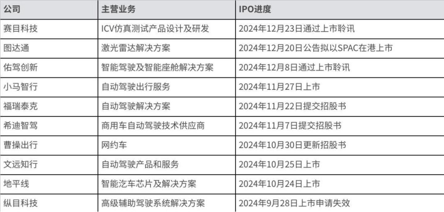 2024年,国内智能驾驶行业最为突出的一大特点即是“扎堆上市”。据“趣解商业”统计,截至2024年年底,国内至少共有14家智能驾驶相关企业在港交所或纳斯达克完成上市或提交上市申请,基本上涵盖了智驾芯片、解决方案和Robotaxi运营等智能驾驶全产业链企业。