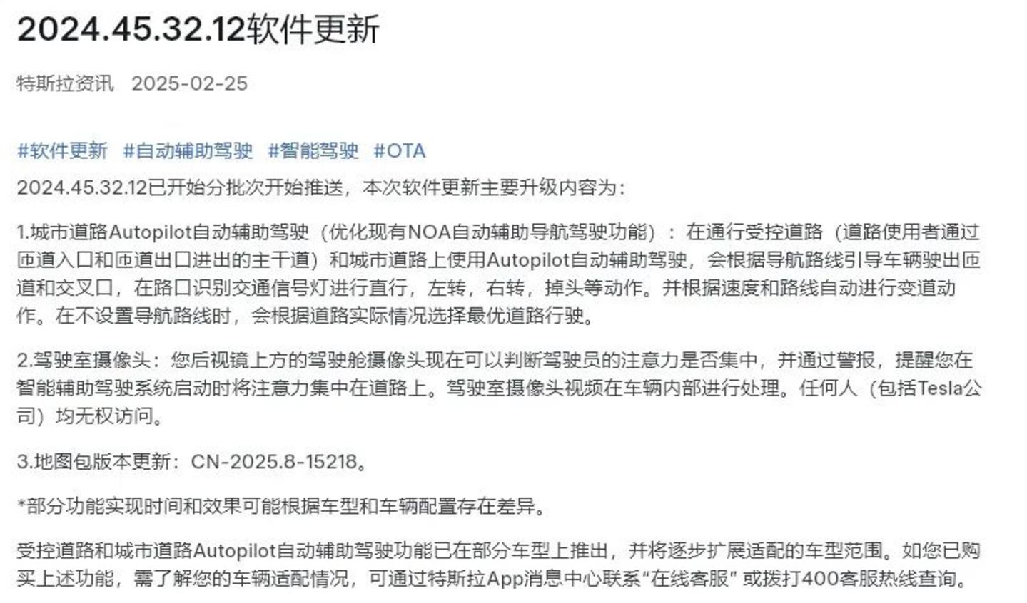 而此次特斯拉发布的消息是,其将为中国客户分批次更新软件。据“趣解商业”了解,特斯拉将在 2024.45.32.12 软件中分批次更新,更新后将主要新增以下 4 个核心功能,其中包括:在通行受控道路和城市道路上,根据导航路线引导车辆驶出匝道和交叉口;在路口识别交通信号灯进行直行,左转,右转,掉头等动作;根据速度和路线自动进行变道动作;在不设置导航路线时,会根据道路实际情况选择最优道路行驶。