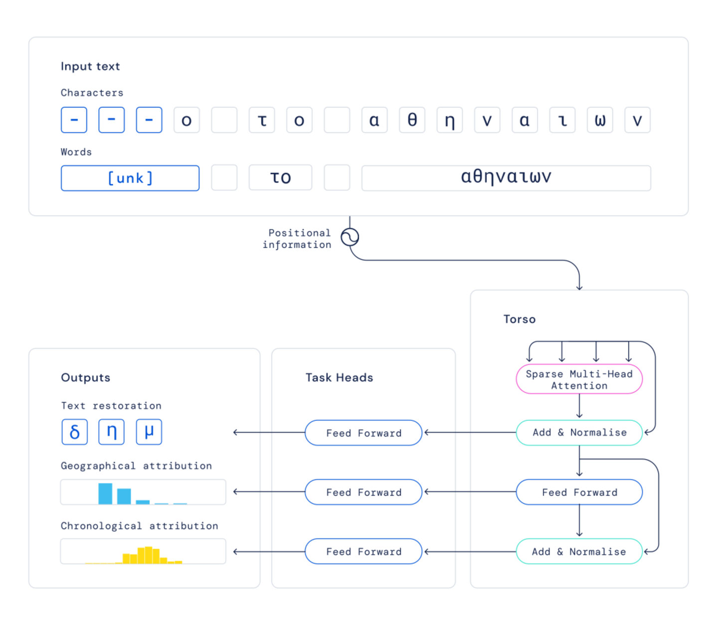 ▷ 伊萨卡(Ithaca)的架构。文本中受损部分用短横线“-”表示。在此例中,项目组人为损坏了字符“δημ”。基于这些输入,伊萨卡能够恢复文本,并识别出文本撰写的时间和地点。图源:deepmind