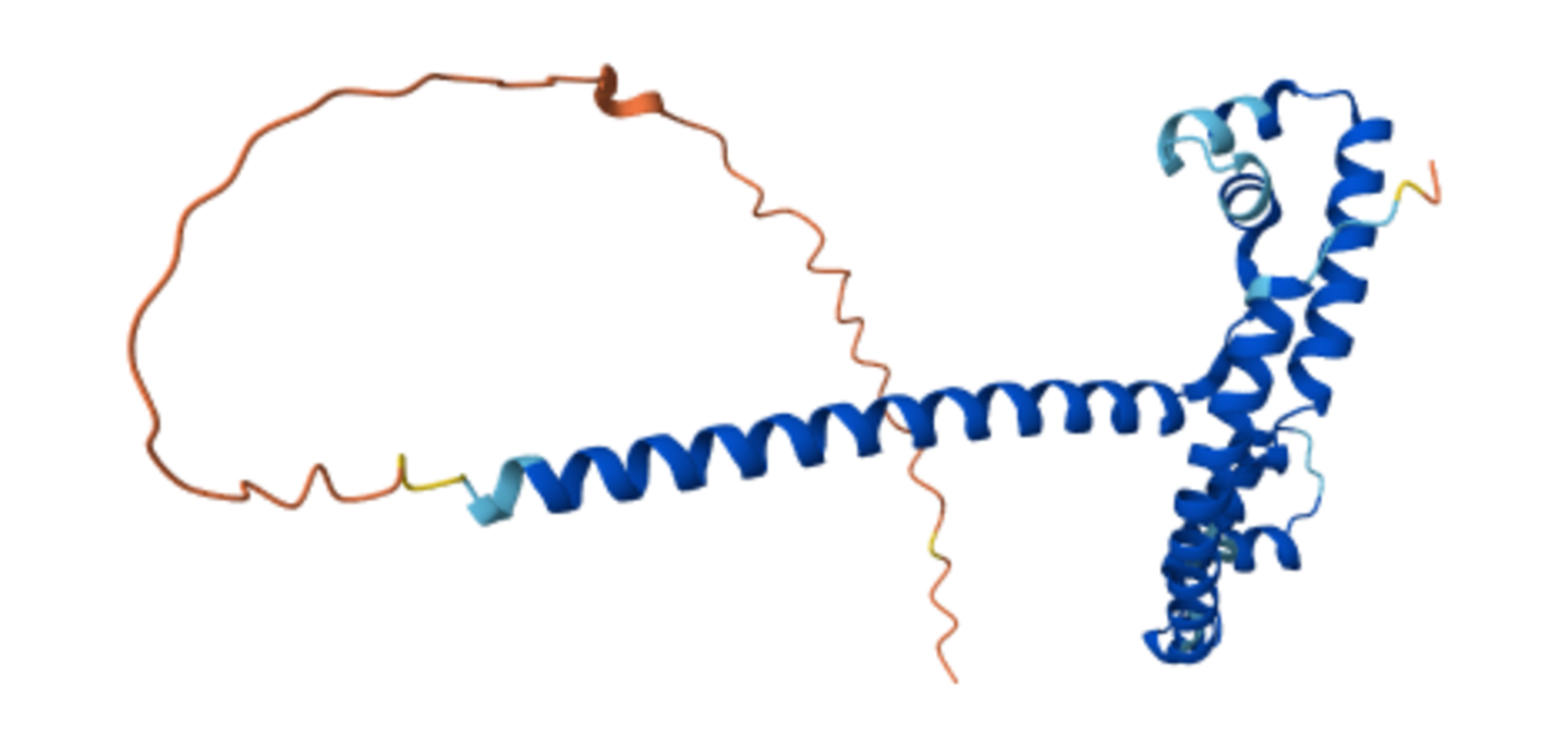 ▷ alphafold预测的某蛋白结构图,颜色越蓝可信度越高,越红可信度越低。图源:AFDB