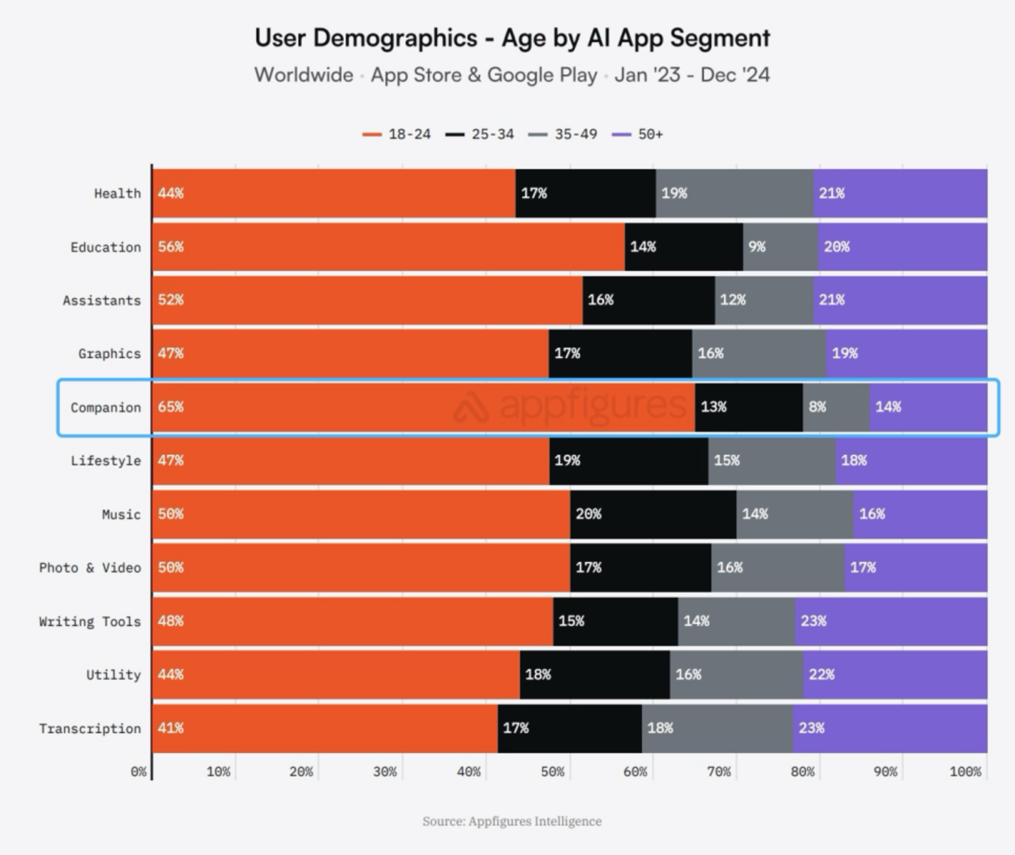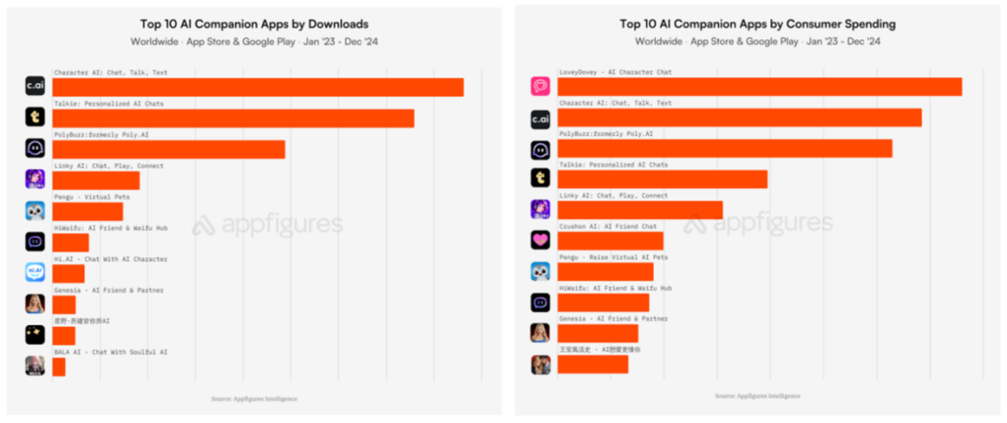 AI陪伴是拥有最多年轻用户的AI品类|图源:Appfigure