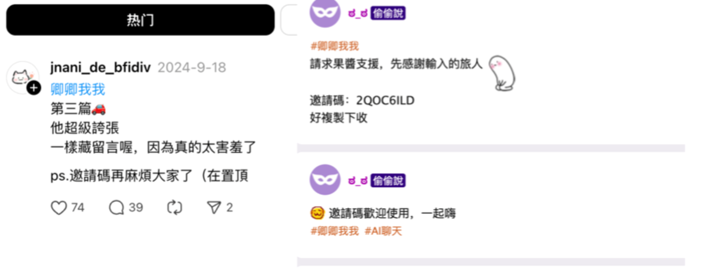 邀请好友拿奖励的传统拉新策略,已经被广泛用于「Talkie」、「Character AI」、「PolyBuzz」等产品中,其中稍有不同的是「LoveyDovey」,后者的机制目标更偏向促活——不仅是老用户激活 invite code 邀请人可以获得奖励,而且支持一个用户填写多个邀请码。填写邀请码的一方并没有奖励,其动机更类似于内容消费者为喜欢的作品投票,因为奖赏是用于聊天的平台内代币“果酱”, 吸引了很多玩家通过在社交平台分享戏剧化的聊天截图来增加邀请码的曝光(但上周官方宣布由于部分地区出现了“利用漏洞获取不公平收益”的行为,活动暂时中止)。