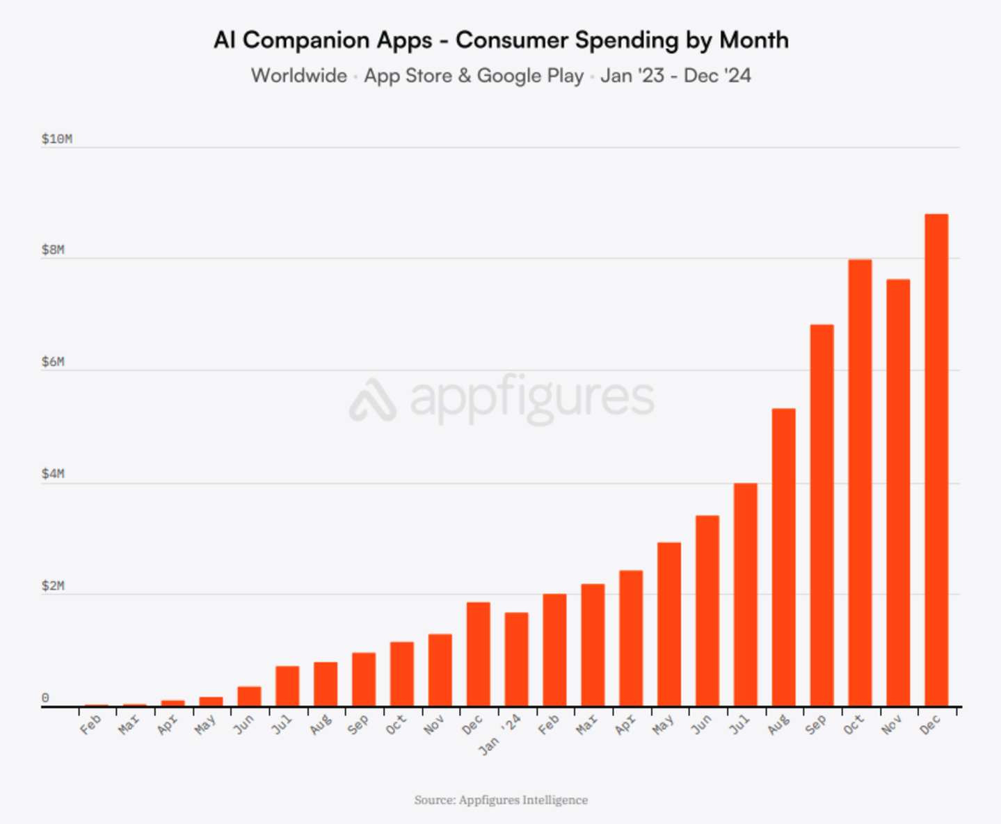 AI陪伴品类内购收入增长趋势图|图源:Appfigure