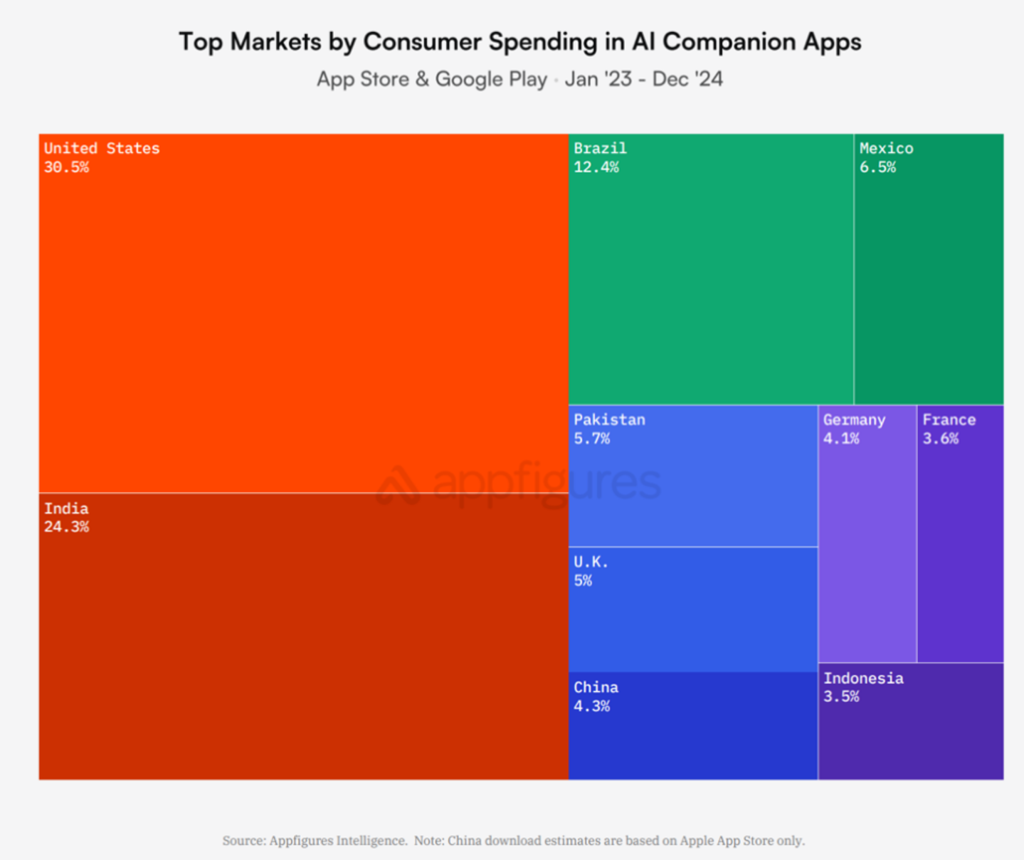 AI陪伴品类不同国家的下载量贡献占比|图源:Appfigure