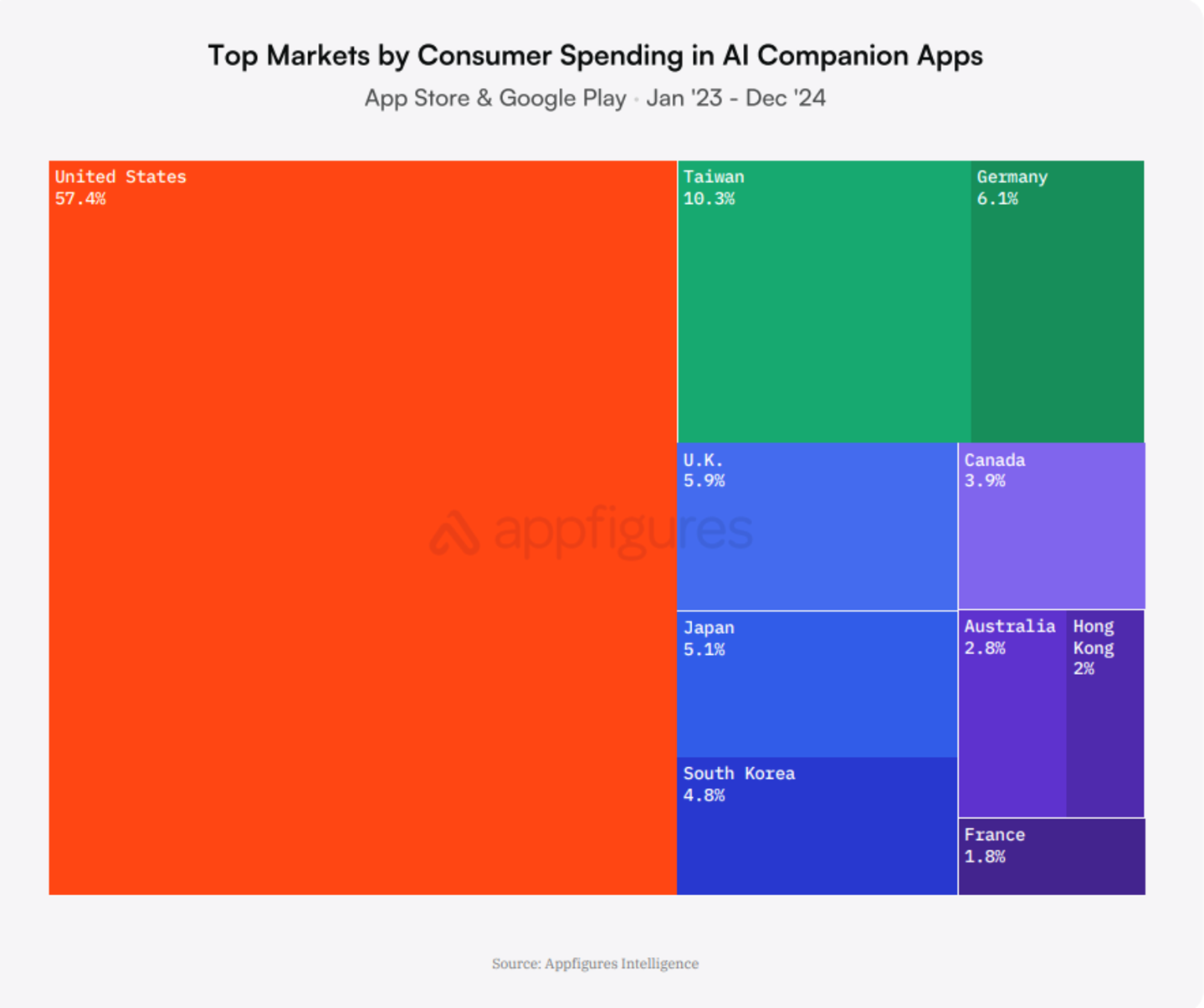 AI陪伴品类不同国家的内购收入贡献占比|图源:Appfigure