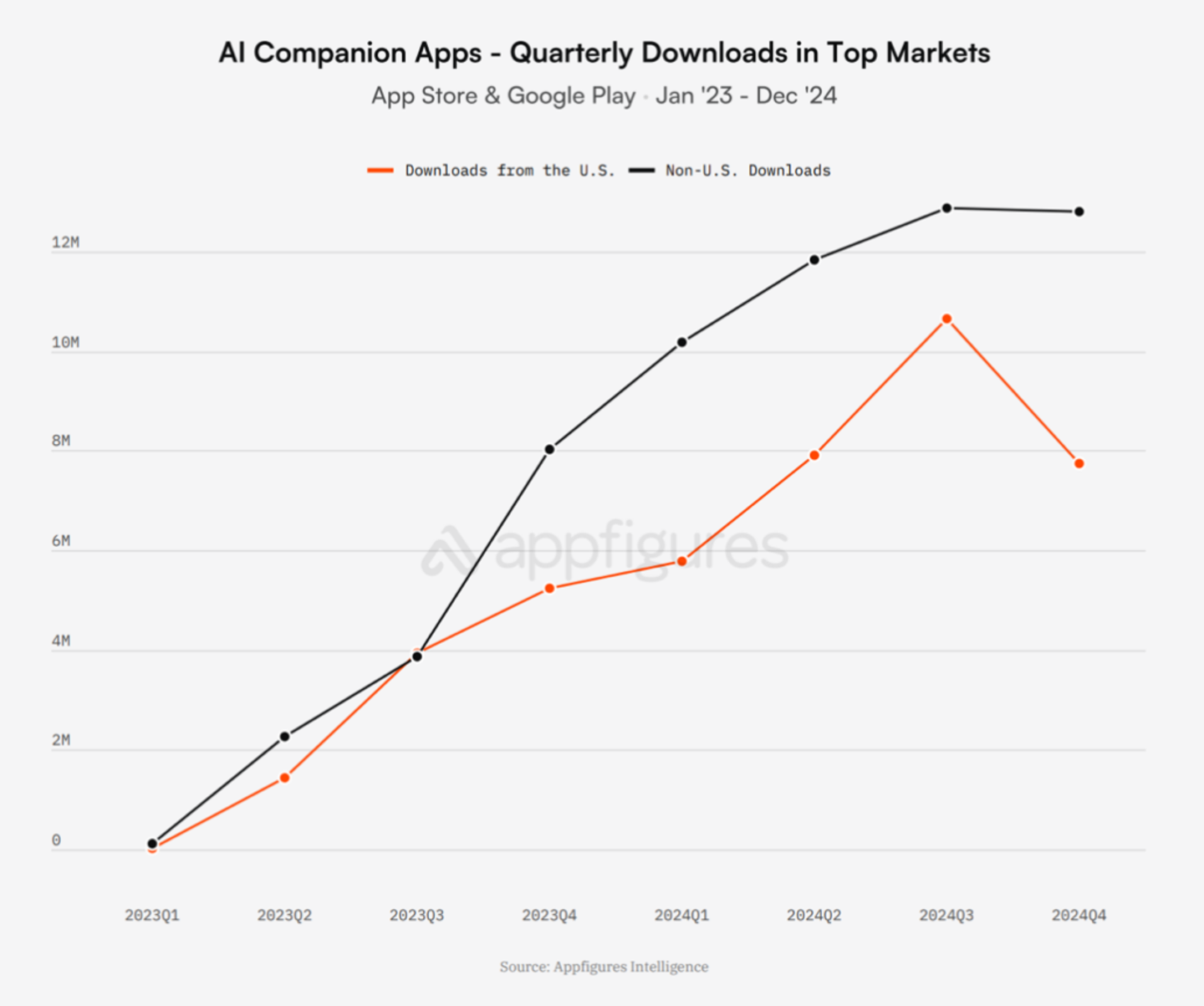 2024年Q4AI陪伴品类在美国的下载量下降明显|图源:Appfigure