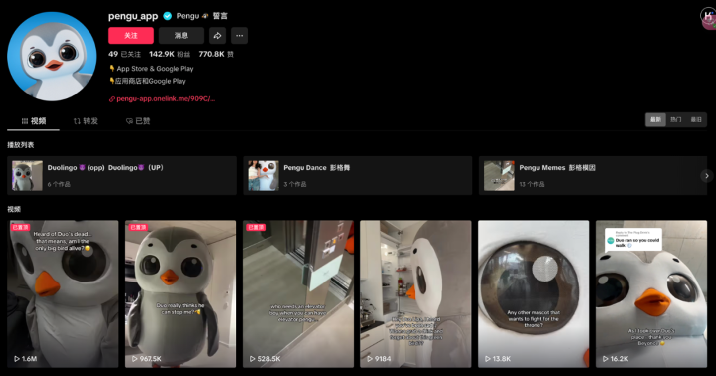 以企鹅毛绒形象出镜的“pengu_app”TikTok账号|图源:TikTok