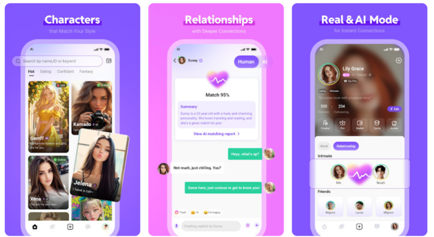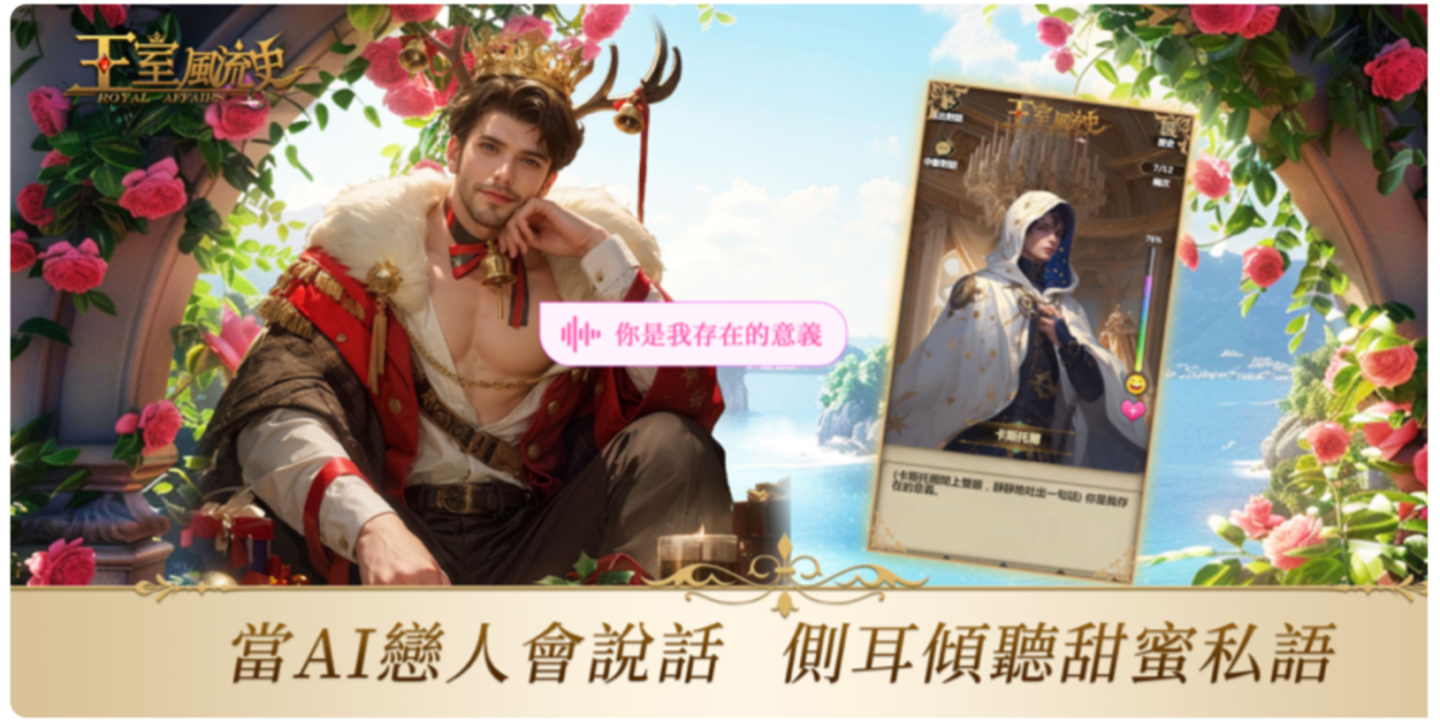 从体验上看,虽然定位均为虚拟陪伴,但 13 款产品提供的服务其实存在较大差异。按 AI 产品经理“潦草学者”的分享,AI 陪伴产品其实可以被细化为互动内容和恋爱陪伴两大方向。「Character AI」、「Talkie」等上榜的多数产品其实属于前者,它们提供的交互体验可以被视作一种新的“内容消费”形式,用户享受的是和不同的 AI 角色共创故事的过程,一定程度上可以类比“互动游戏”。该方向上的产品形态我们此前已见过许多,创新玩法上,榜上或许只有「王室風流史」需要特别提及,这本质上是一款中世纪欧洲王室题材的卡牌 RPG 游戏,其以接入 AI 聊天功能的后宫系统作为差异点。在完整的世界观背景下,AI 角色的解锁与主线任务推进、抽卡系统等都有关联,并延伸出约会、子嗣培育等玩法,让游戏更具拟真感。