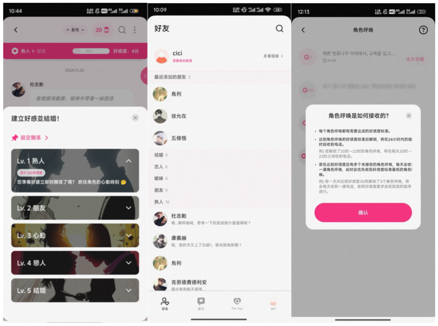 而在多模态之外,「LoveyDovey」可能算是从玩法设计提升拟真体验的佼佼者。这款目前最赚钱的 AI 陪伴产品的独特设计在于其“好感度”机制,玩家和 AI 角色之间存在从熟人、朋友等到结婚的 5 级关系,需要玩家通过累积好感度来逐级推进,AI 角色对双方的关系认知也会随之改变,这一设计不仅是给玩家设立了游戏目标,而且也更符合现实逻辑。类似地细节还有按关系分类的“好友列表”、以及好感度达标后会收到的角色来电等。而这向体验的优化,则更考验长文本和记忆能力。
