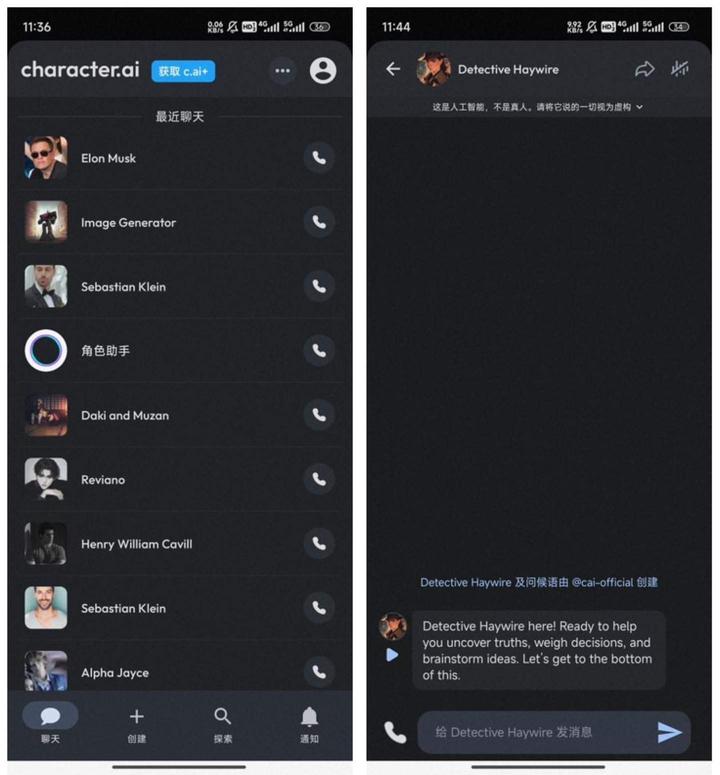 「Character AI」无论是在首页或是聊天页面都将“Character Calls”功能放在了相当醒目的位置