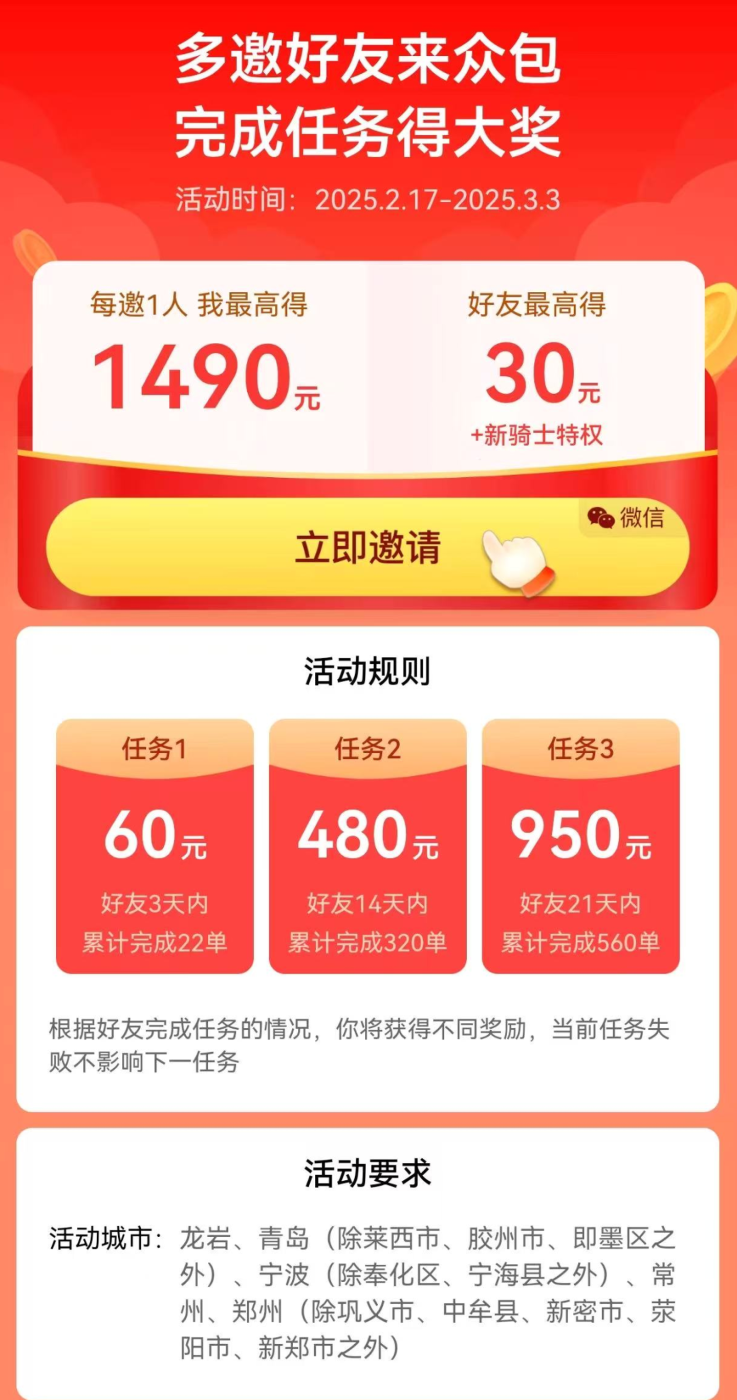价值星球看到,近期京东旗下的达达配送,已经在龙岩、青岛、宁波、郑州等城市,推出“多邀好友来众包”的活动,每邀请1人至高得1490元高额奖励的活动,对新外卖员首单还给与9元的奖励。