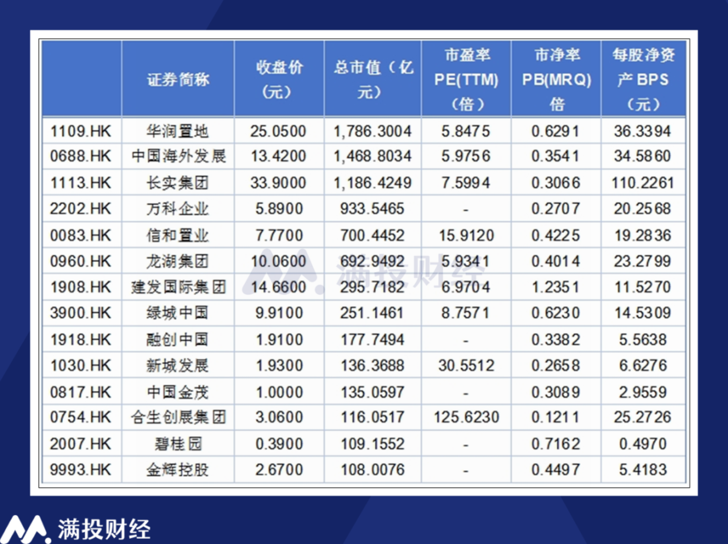 从市场估值角度来看,截至2月21日,港股市场中市值超过100亿元的房地产开发上市公司共有14家。除去建发国际(1908.HK),其余公司均处于破净状态。在经历三年的下跌后,有些公司的每股净资产甚至数倍于其股价。