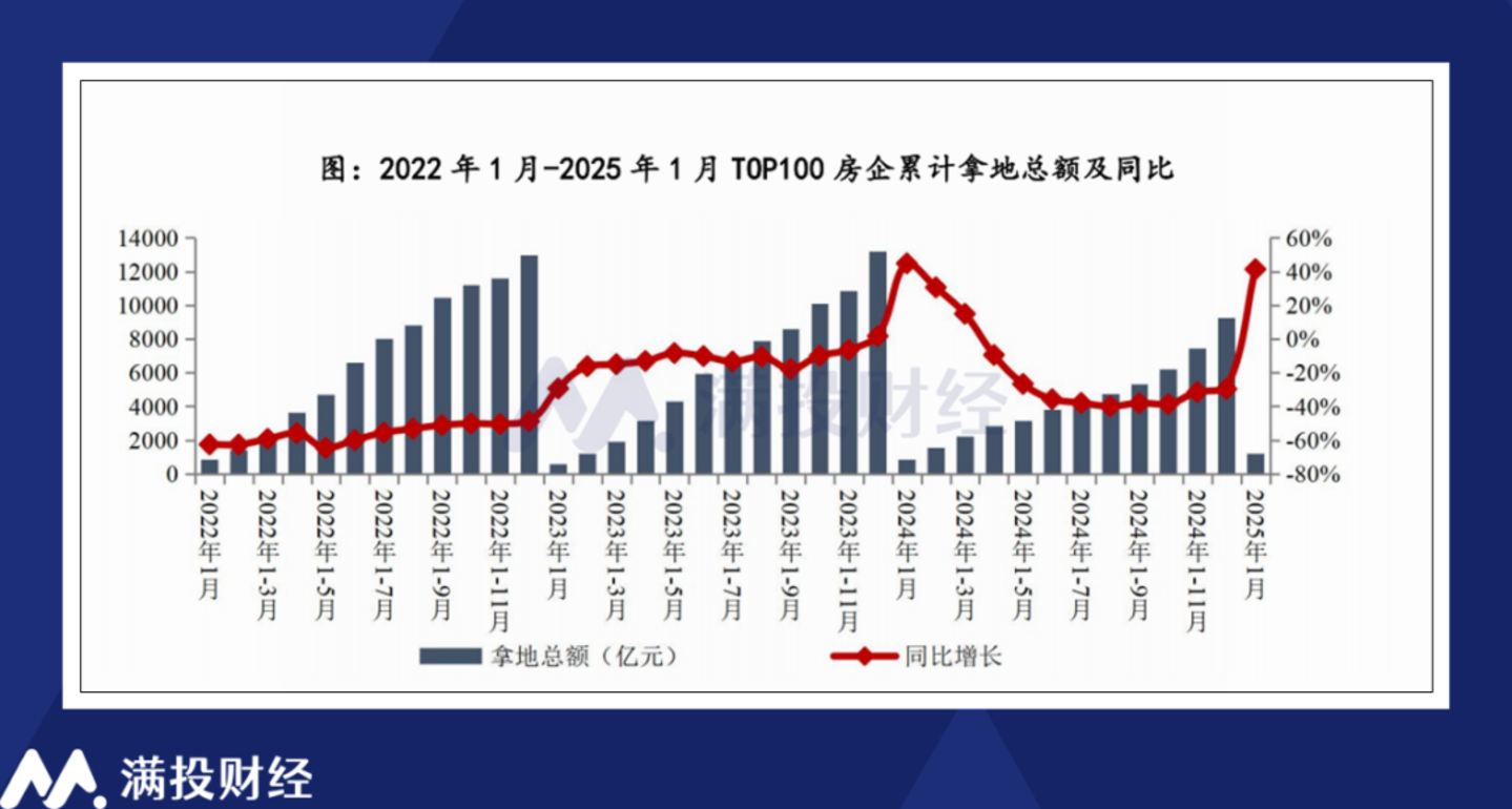 在房屋销售之外,1月各大房企的拿地热情比较超出市场预期。2025年1月,TOP100企业拿地总额1210.7亿元,同比增长41.4%,相较上年由负转正。其中,北上广深等一线城市的土地推出以及土地交易均较为活跃,一线城市住宅和商办用地土地出让金同比增长超10%,且有多宗较高总价地块成交。