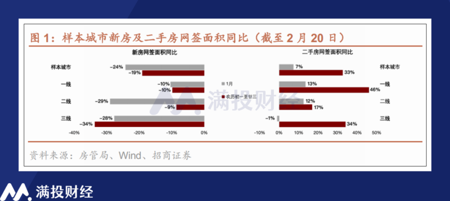值得注意的是,房企销售数据的疲软,除了受到春节假期的影响外,可能还与前期政策效力的逐渐减弱有关。根据招商证券统计,春节后(1月29日—2月20日)的二手房成交数据较去年农历同期(2024年2月10日—3月3日)增加了33%,表现较好,但新房的数据表现则相对平淡,累计成交较去年同期减少19%。