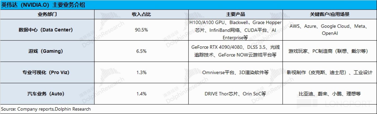 1)数据中心业务:是当前最主要的关注点,其主要产品包括 H100、A100、Blackwell 等算力芯片,公司的核心客户是亚马逊、微软、谷歌等云服务大厂;