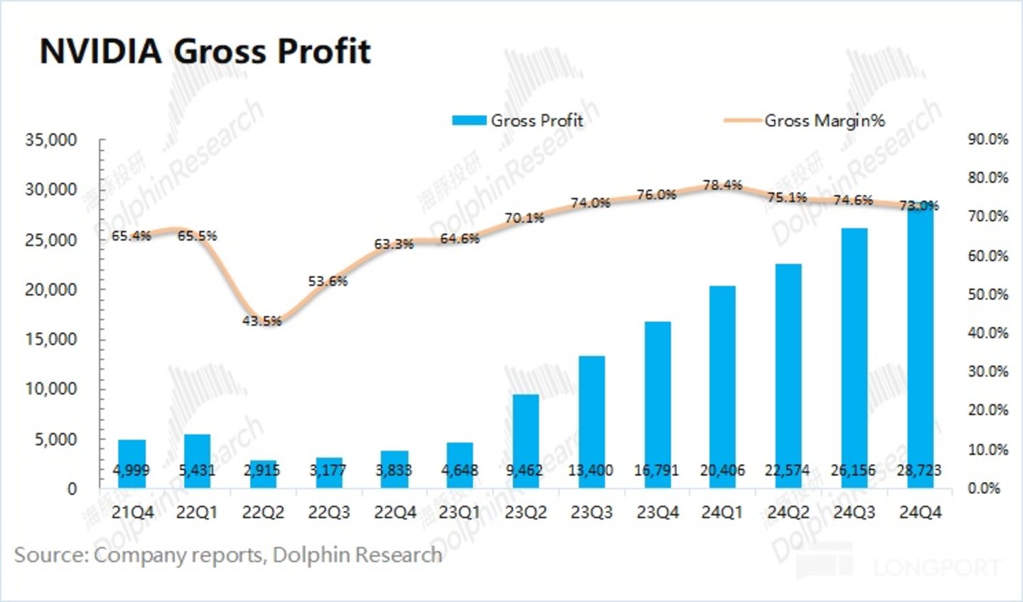 2025 财年第四季度英伟达净利润 221 亿美元,同比增长 79.8%。本季度净利率为 56.2%,有所提升。本季度收入端的高增长,继续稀释公司的经营费用率。虽然毛利率有所回落,但净利率已经保持在 55% 以上的较高水位