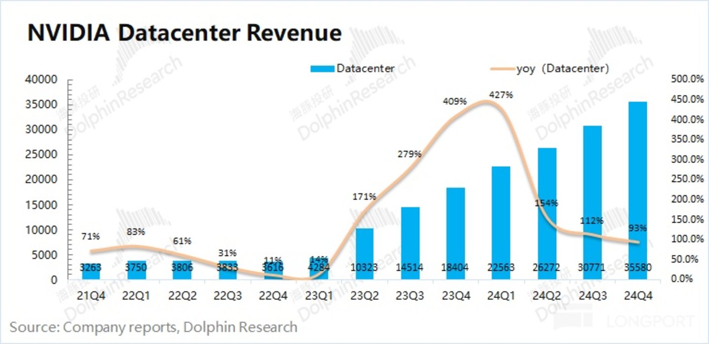 3.1 数据中心业务:2025 财年第四季度英伟达数据中心业务实现营收 355.8 亿美元,同比增长 93.3%。数据中心业务是市场的最大关注点,本季度增长主要是由 Blackwell 产品和 H200 出货增长的推动,主要应用于大型语言模型、推荐引擎和生成式 AI 应用程序的训练和推理。公司本季度数据中心的同比增长是由计算端的需求来推动的。