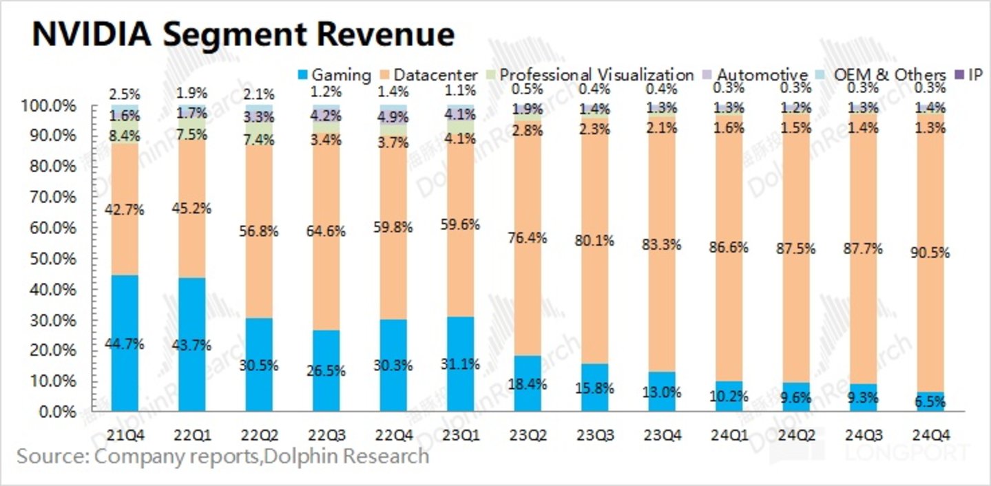 随着英伟达数据中心的增长,当前已经成为公司收入中最大的一项,占比达到 9 成。虽然游戏业务也在增长,但占比还是被挤压至 1 成以下。