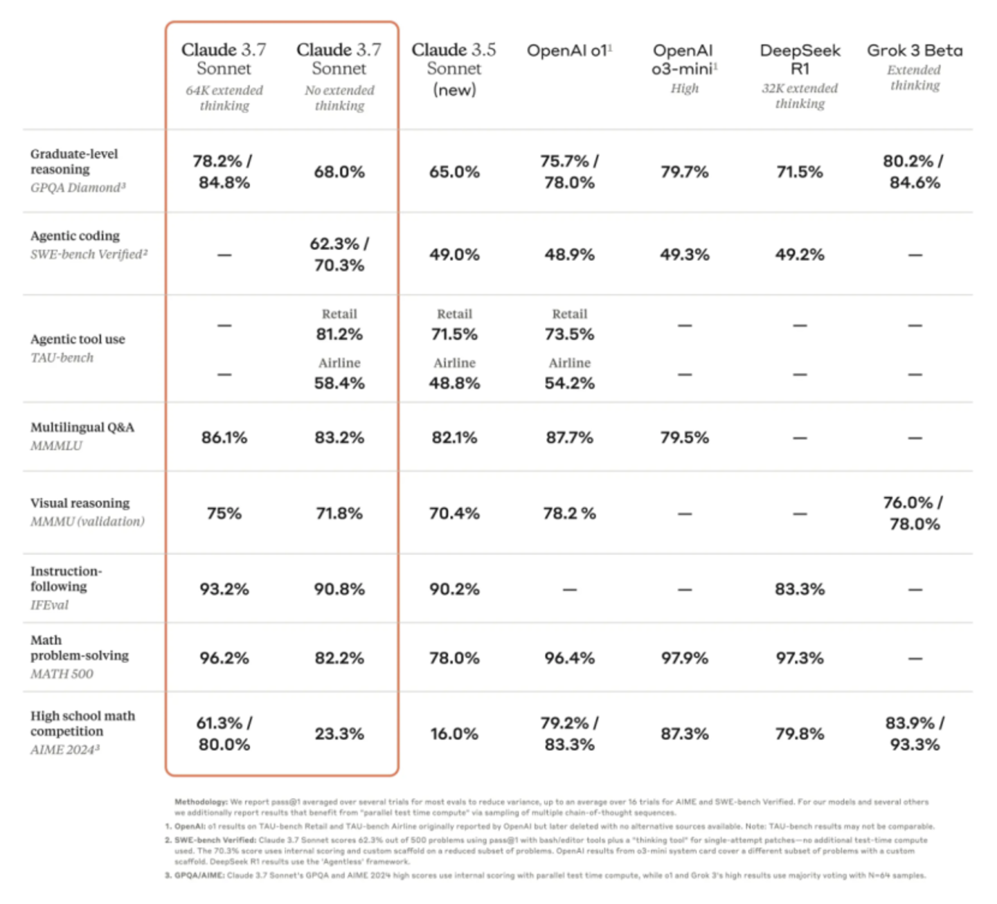 不同于阿里QwQ-Max-Preview,同一天发布的Anthropic新模型Claude 3.7 Sonnet,则是个彻彻底底的完整体,官方直接放出了多项评测指标对比。