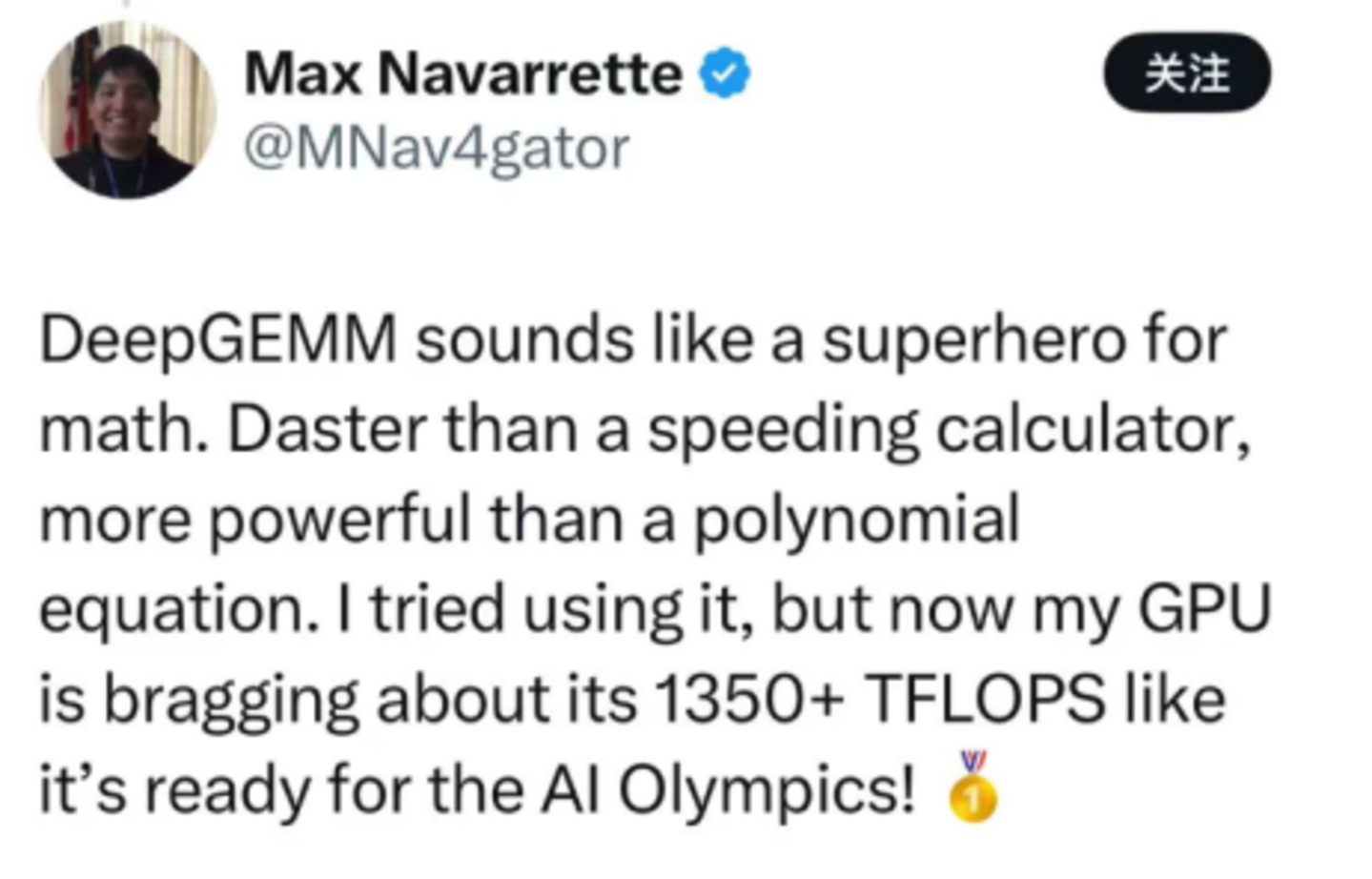 “DeepGEMM像是数学领域的超级英雄,快过超速计算器,强过多项式方程。我尝试使用DeepGEMM时,现在我的GPU在计算时以每秒超过1350 TFLOPS(万亿次浮点运算)的速度运转,好像已经准备好参加AI奥运会了!”一位开发者兴奋地在X上表示。