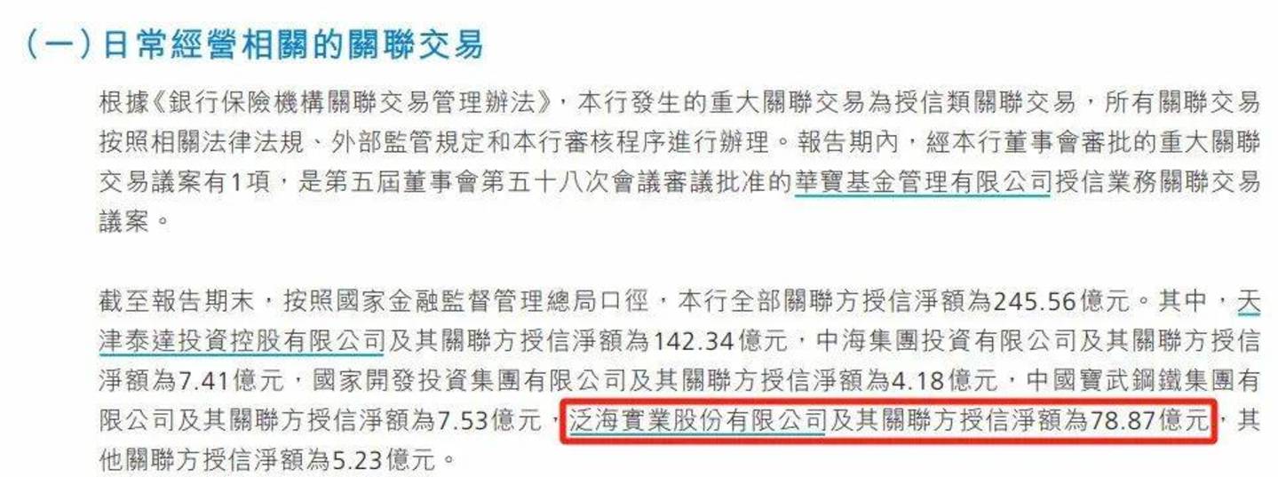 截至报告期末,按照国家金融监督管理总局口径,渤海银行全部关联方授信净额为245.56亿元。其中,泛海实业股份有限公司及其关联方授信净额高达78.87亿元。