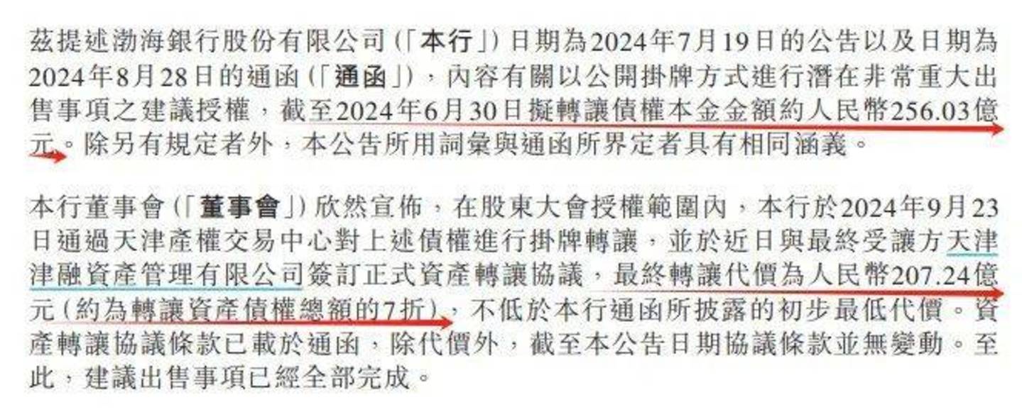 2024年11月,渤海银行发布公告称,于2024年9月23日通过天津产权交易中心对本金金额约256.03亿元的债权进行挂牌转让,并与最终受让方天津津融资产管理有限公司签订正式资产转让协议。