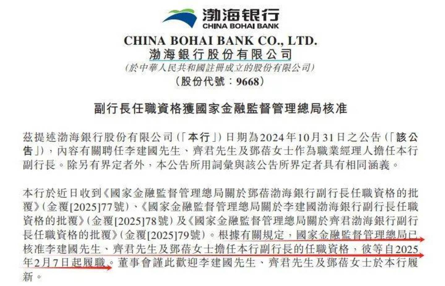 2月10日,渤海银行公告称,近日收到监管批复,李建国、齐君及邓蓓担任渤海银行副行长的任职资格获得核准,自2025年2月7日起履职。