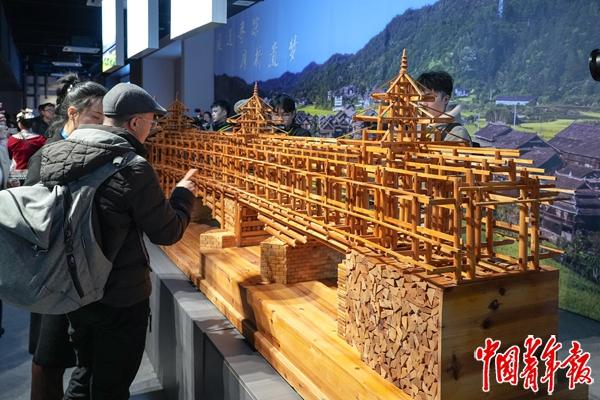 3月18日,廊桥保护三年行动成果展上,观众在参观廊桥模型。中青报·中青网见习记者 陈宇龙/摄