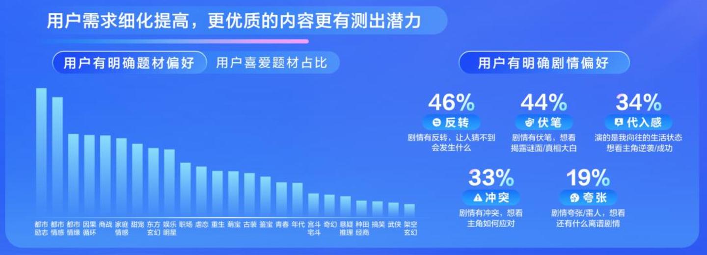 数据显示,短剧用户有明确的题材和剧情偏好,比如,都市励志、都市情感题材受欢迎程度遥遥领先,反转、伏笔、代入感、冲突等剧情受到用户偏爱。