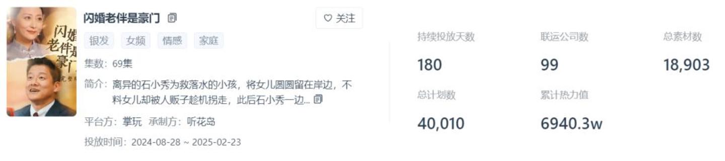 根据DataEye-ADX短剧版数据显示,点众的爆款 IP 改编剧《桃花马上请长缨》累计热力值超1.4亿,《闪婚老伴是豪门》接近7000万,分别位列2024年年度百强热剧榜第1和第5名。