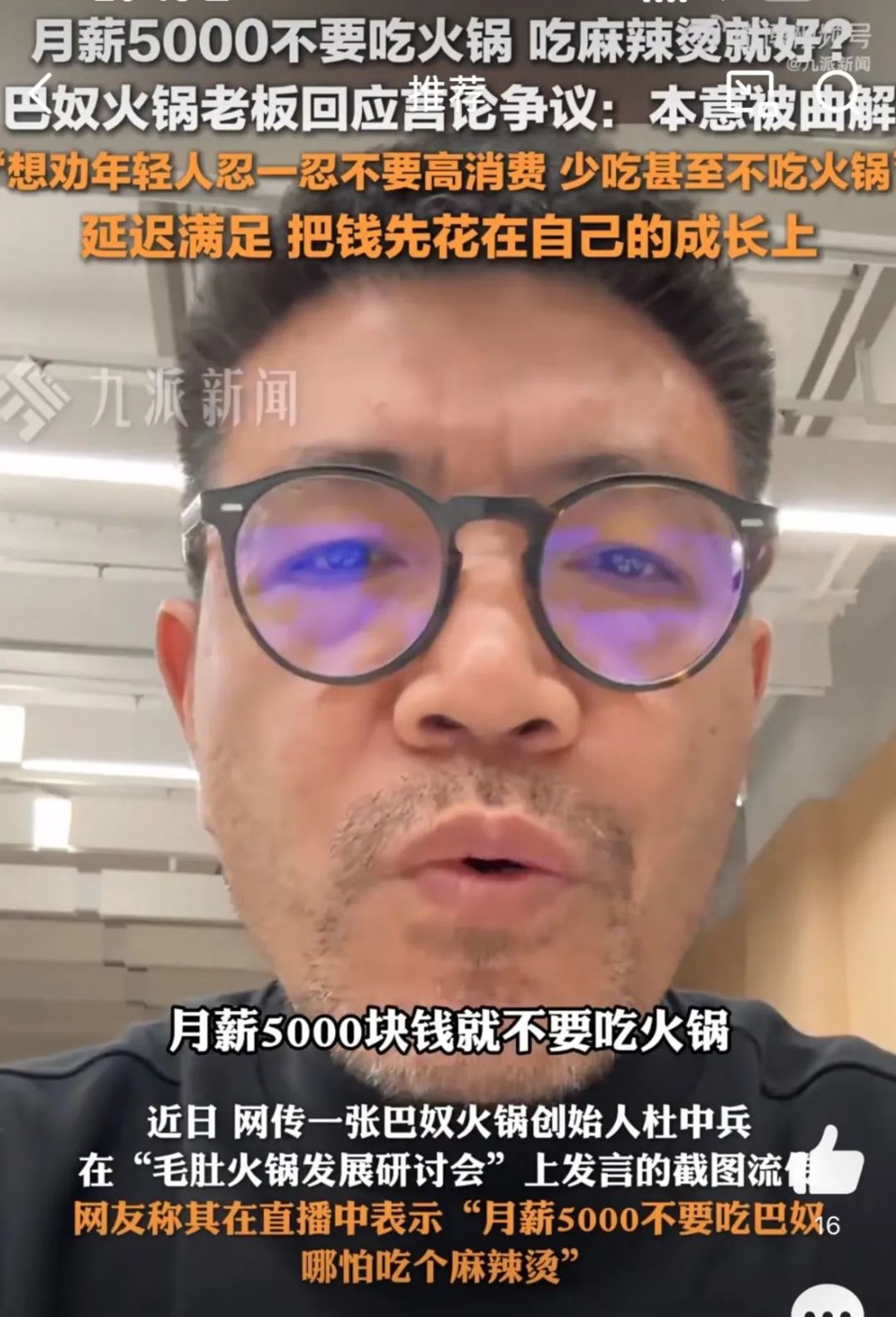 27日上午,杜中兵通过个人视频账号回应「月薪五千别吃火锅」言论称,希望大家不要误解(他的)真实意思。